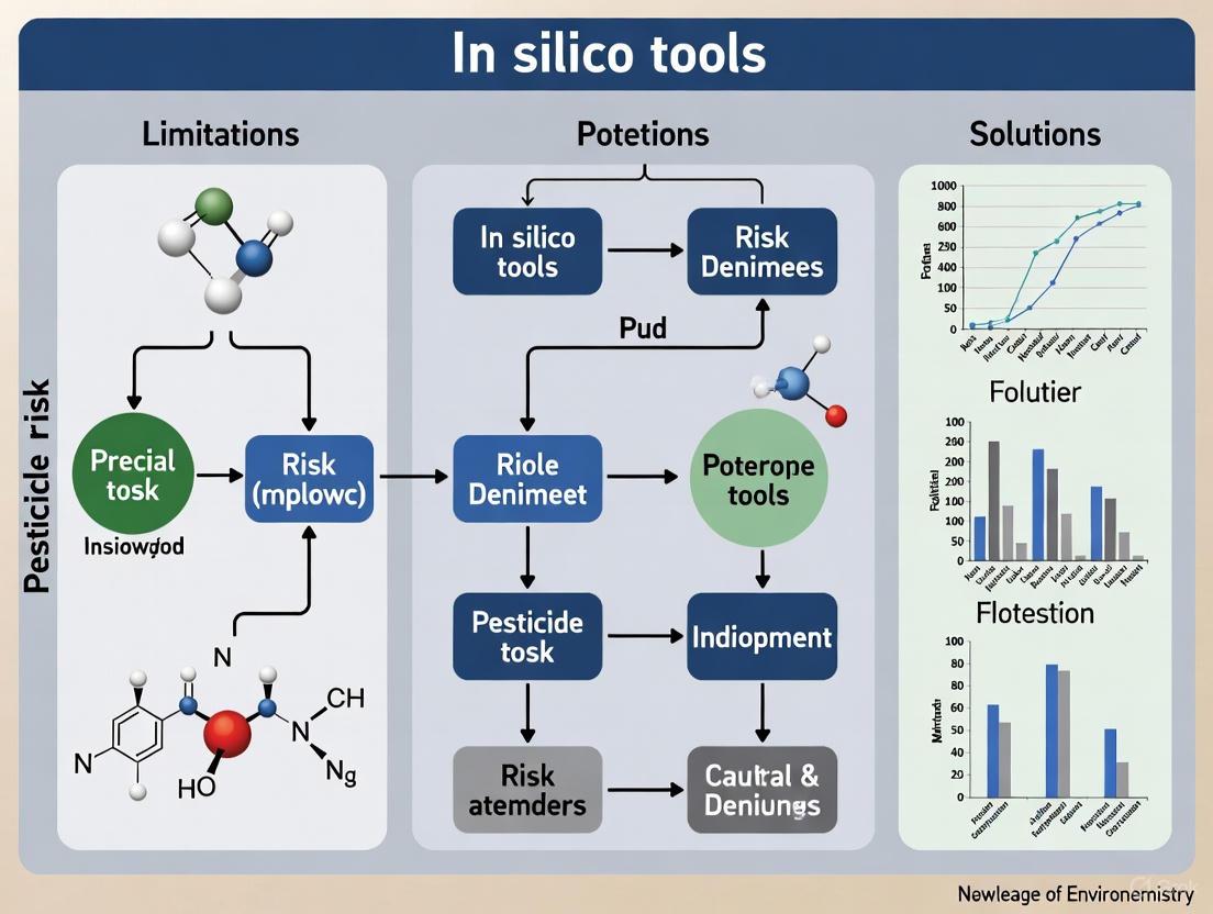 The integration of robust in silico tools represents a pivotal shift towards a more efficient, ethical, and predictive paradigm for pesticide risk assessment. Success hinges on systematically overcoming current limitations through strategic data curation, advanced AI methodologies, and rigorous validation within integrated testing strategies. Future progress depends on collaborative efforts between researchers, industry, and regulators to standardize approaches, expand chemical space coverage, and embed these New Approach Methodologies into core regulatory frameworks. This evolution will not only accelerate the safety assessment of existing pesticides but also proactively guide the design of safer, sustainable chemicals, ultimately strengthening the protection of human health and the environment.