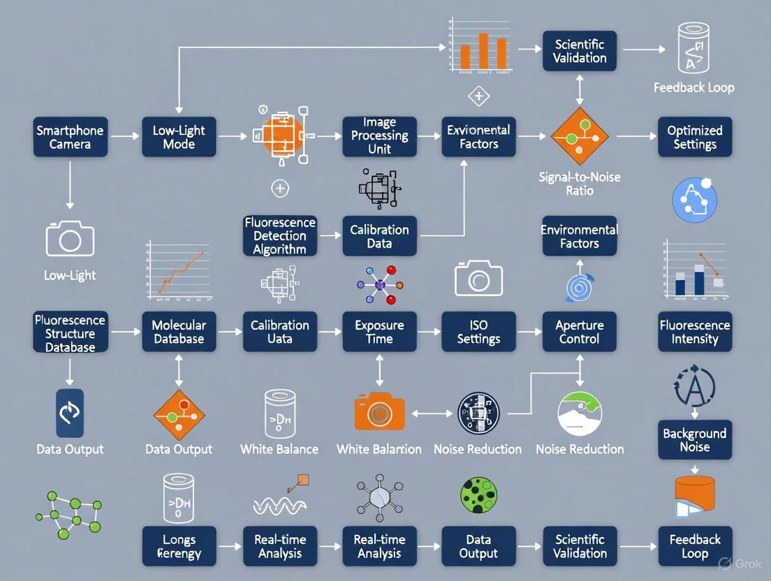 This article provides a comprehensive guide for researchers and drug development professionals on leveraging smartphone cameras for sensitive, quantitative low-light fluorescence detection. It covers the foundational principles of smartphone-based detection systems, details methodological setups for applications from biosensing to super-resolution imaging, and offers strategies for troubleshooting and optimization to enhance sensitivity and reduce noise. The content also includes validation protocols and performance comparisons with traditional instrumentation, highlighting the potential of this portable, cost-effective technology to transform point-of-care testing and clinical diagnostics.